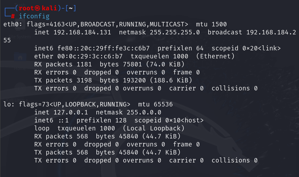 kali里面用ifconfig扫描,查看网络配置和我们自己的ip地址,这里可以发现是192.168.184.131