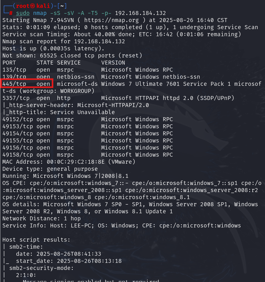 然后对这个靶机进行详细扫描,检查445端口
