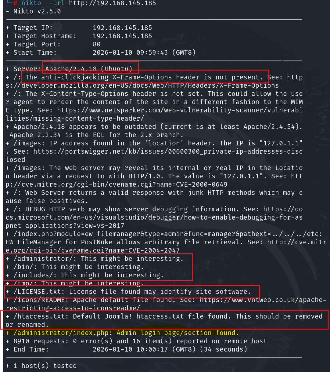 /administrator/→ 登录页面/tmp/→ 尝试上传文件/includes/→ 找配置文件(数据库密码)- /bin/ ➡可能包含脚本文件